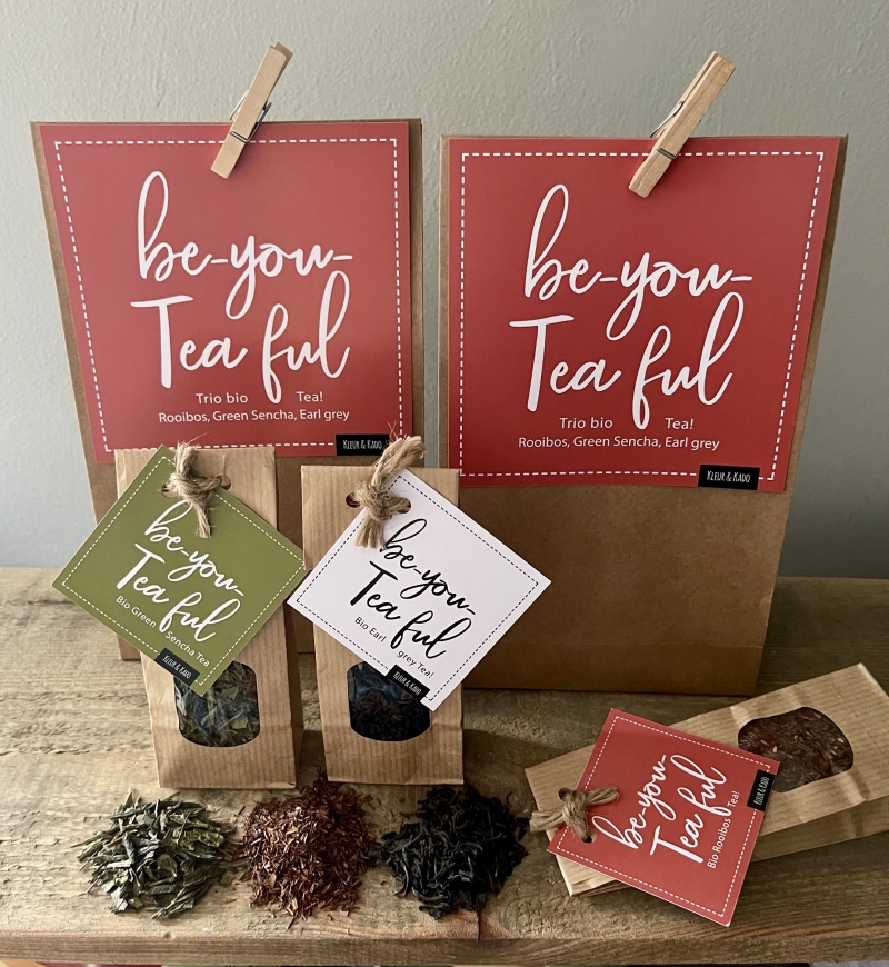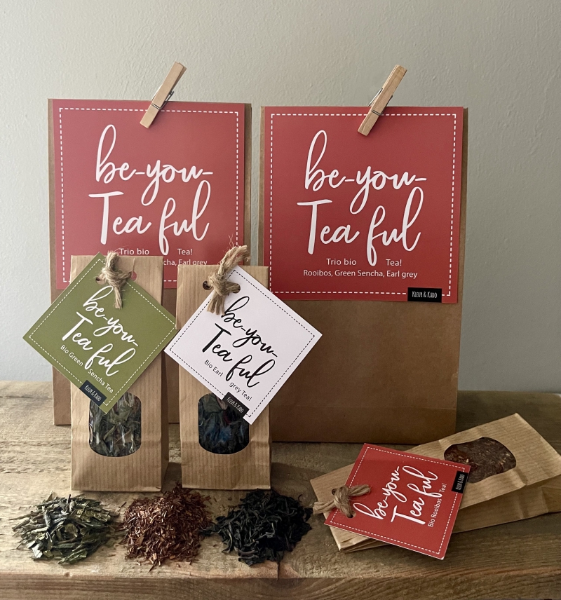 Gevuld met (h)eerlijke verse biologische losse thee: Rooibos, Green sencha en Earl grey.