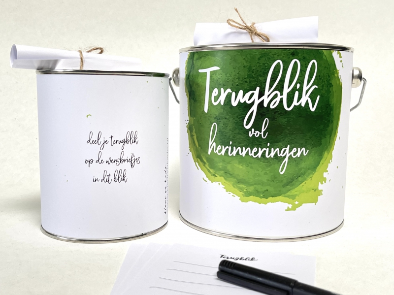 Leverbaar in 1L en in 2,5L blik met hengsel voor de grote herinneringen.1L blik bevat 8 briefjes met touwtjes, 2,5L bevat 16 briefjes met touwtjes.